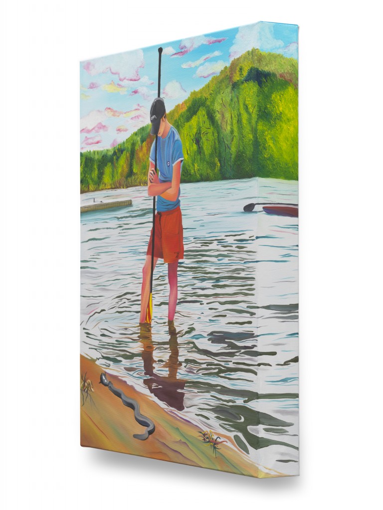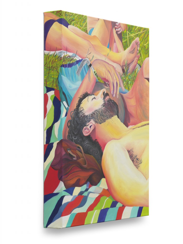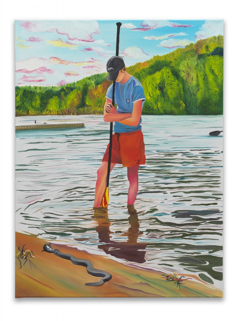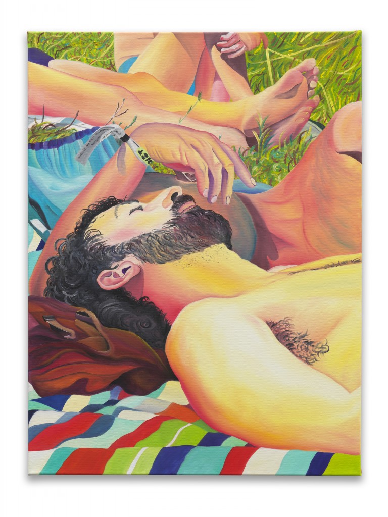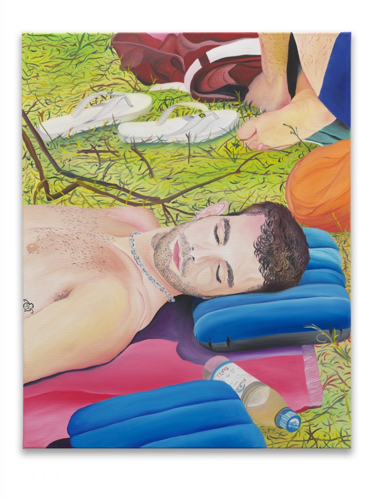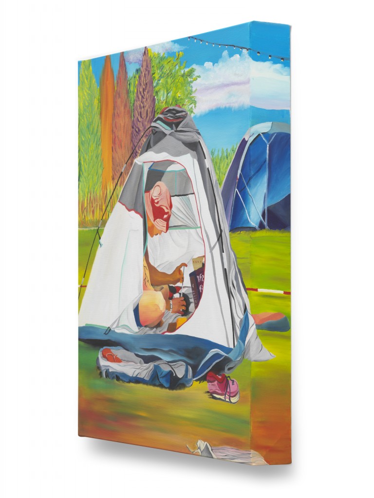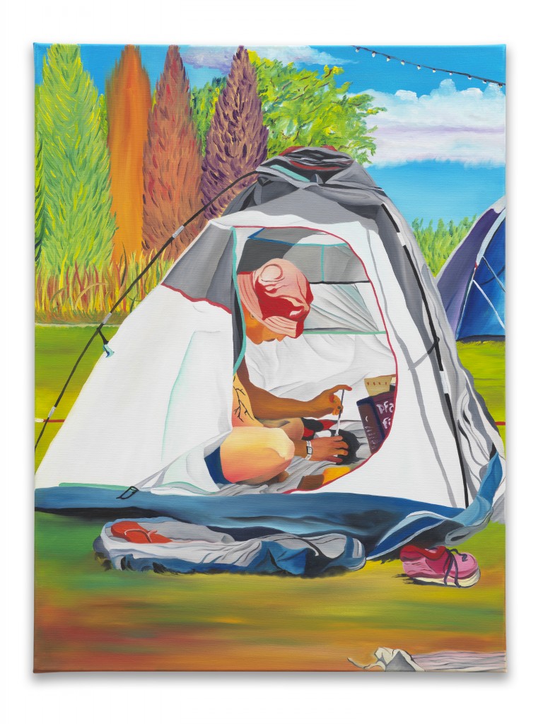 At Whole Festival, Miller witnessed his friends moving through a landscape rich with nature—trees, lakes, rivers, open vistas, and fields. Back in his New York studio, he revisited these memories and began to paint. He recalled his friends preparing their belongings before the party, drifting off to sleep on the grass beneath the shade of trees, and the shared moments of celebration that followed.