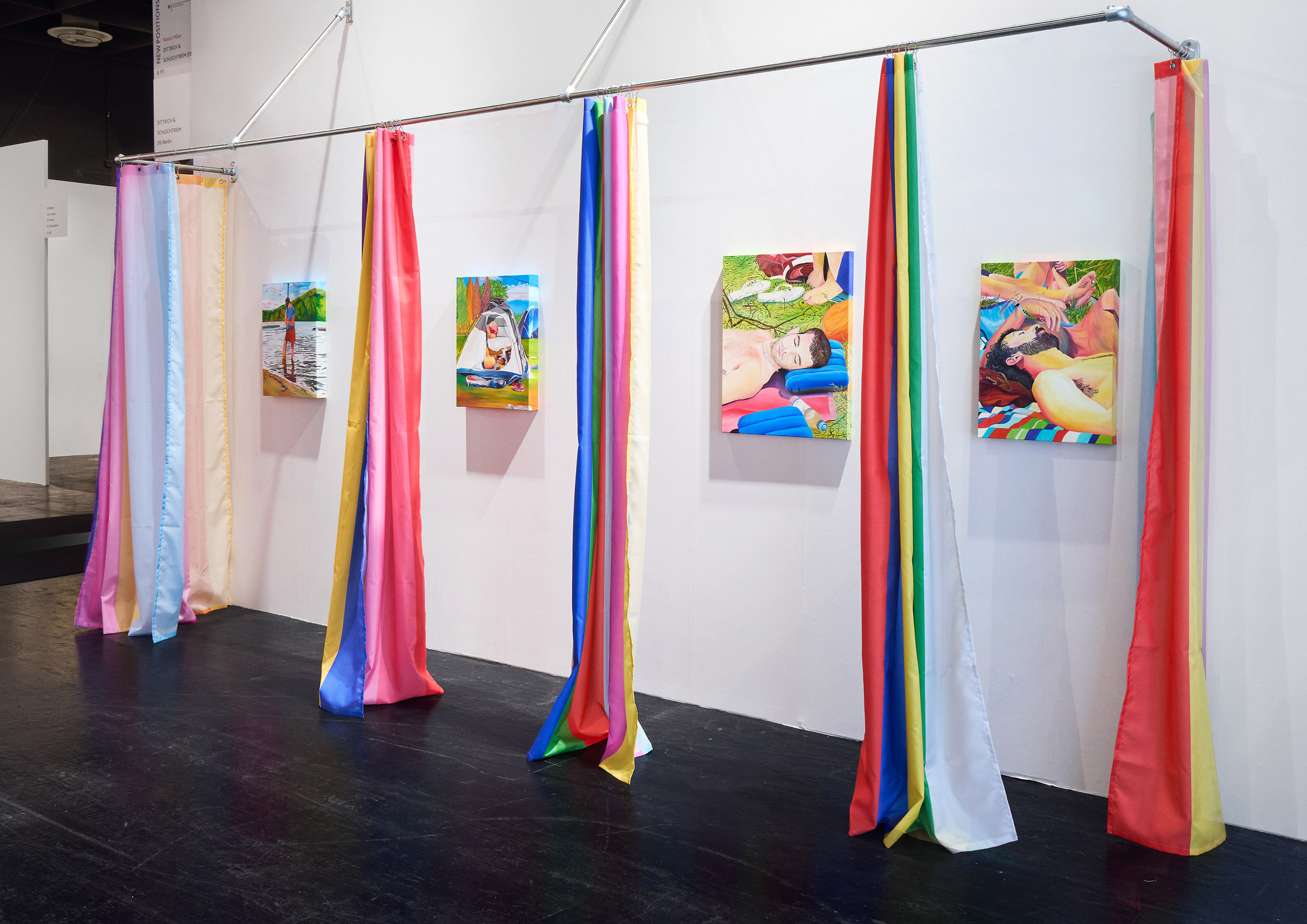 Für NEW POSITIONS präsentiert der Künstler eine lebendige Serie von Gemälden, inspiriert vom Whole Festival 2025, einem queeren Festival für elektronische Musik und Kunst in den Wäldern bei Berlin. Die Präsentation wird durch eine architektonische Intervention ergänzt, die mit Vorstellungen von Privatheit und Gemeinschaft, Verbergen und Offenlegen spielt, umgesetzt durch gestreifte Duschvorhänge – ein wiederkehrendes Motiv, das erstmals in seiner letzten Ausstellung in Berlin auftauchte.