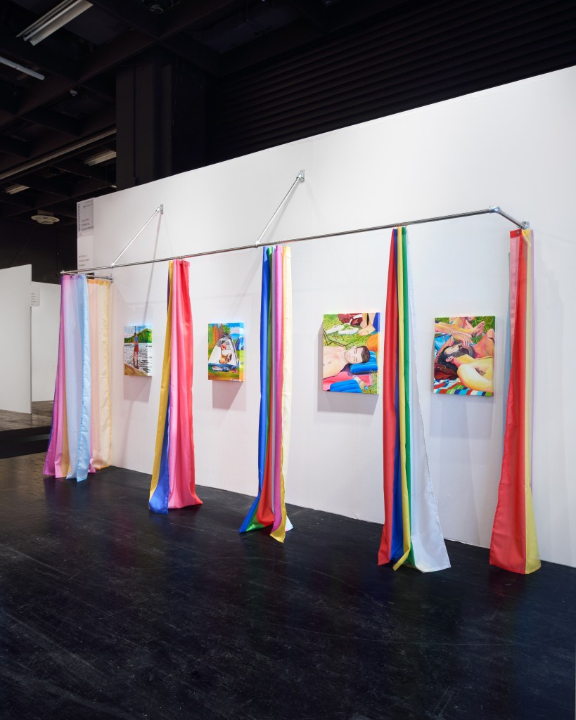 For NEW POSITIONS, the artist unveils a vibrant series inspired by Whole Festival 2025, a queer electronic music and arts gathering set in the forests near Berlin. The presentation also includes an architectural intervention that plays with ideas of personal space and shared space, concealing and revealing behind sets of striped shower curtains, a practice first incorporated in his previous exhibition in Berlin.