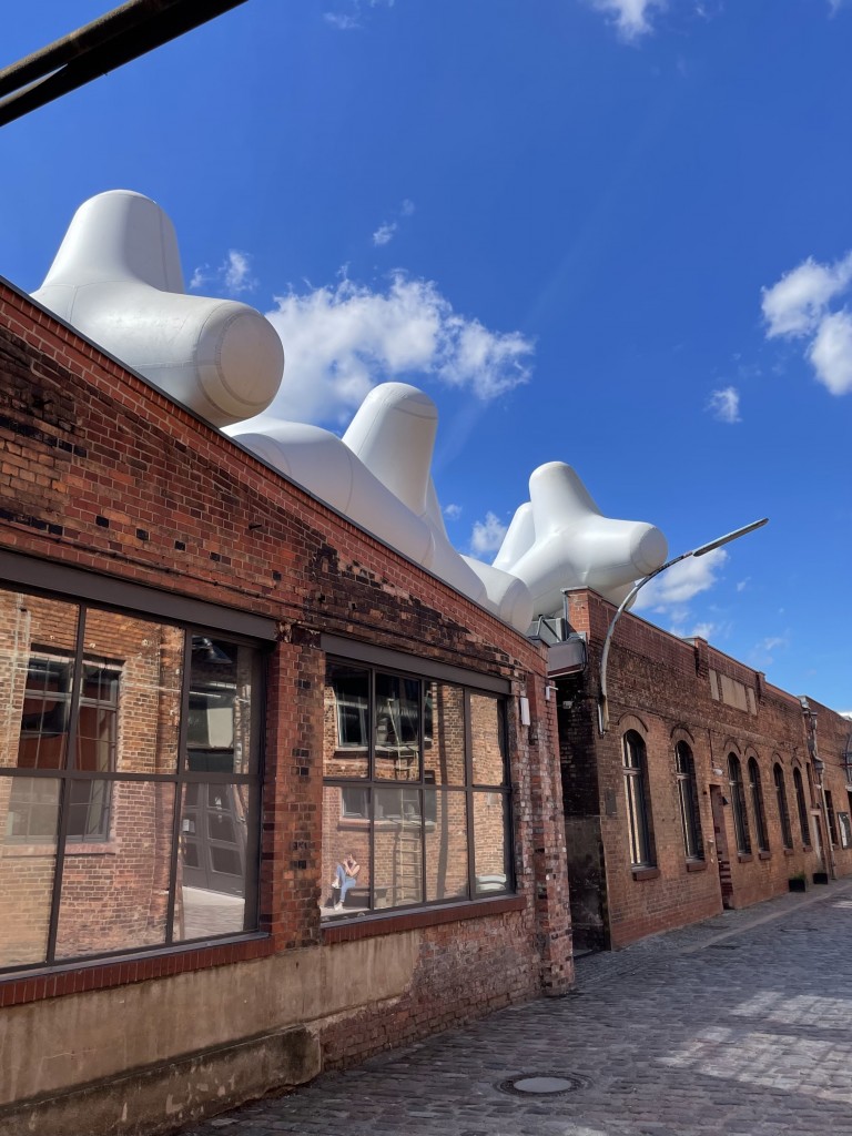 ABIE FRANKLIN & DANIEL HÖLZL, BYCATCH (2022–ongoing), Inflatable tetrapods and safety net, variable dimensions