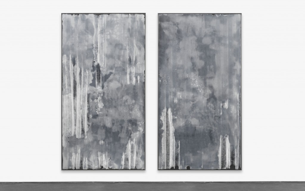 Cycle no. four, 2020, Bio Cornstarch-Packing-Chips, water, aluminum, stainless steel wire rope, 160 x 300 x 5 cm each, exhibited at LOBE Block, Berlin