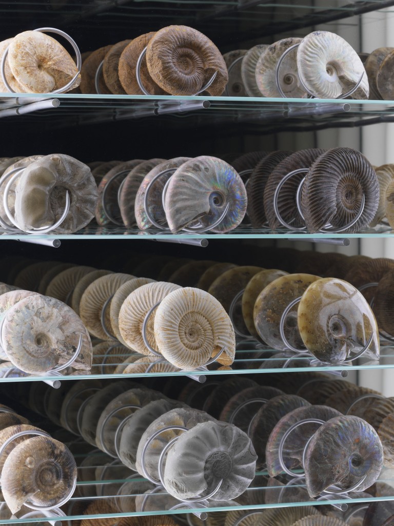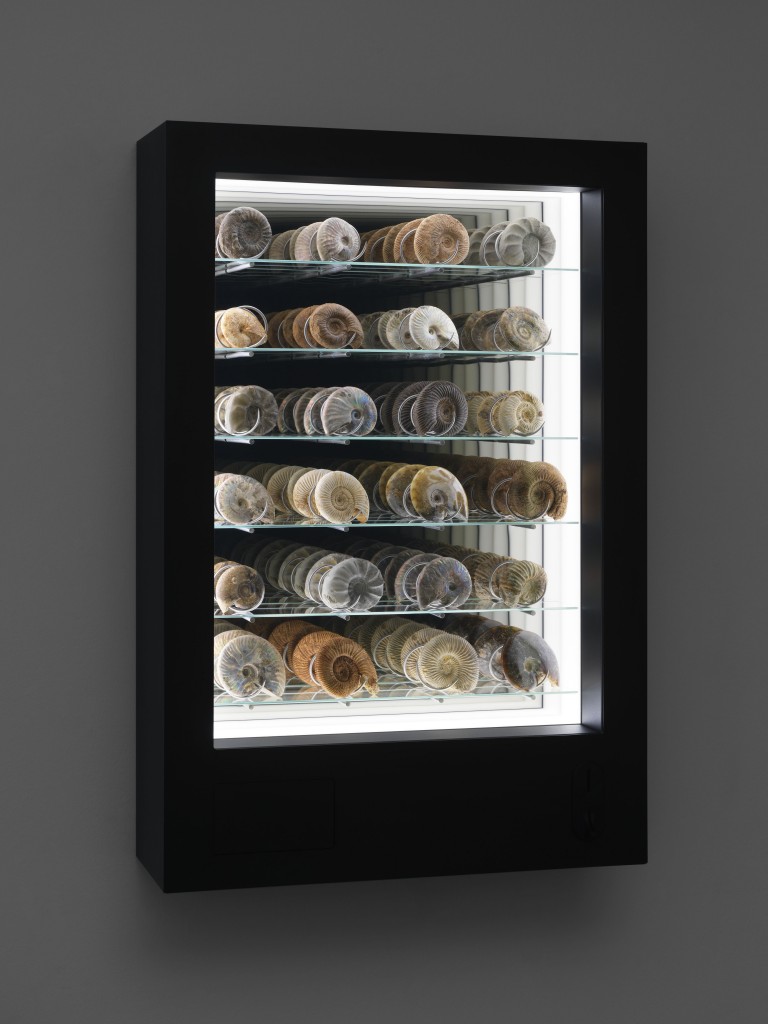 Im zweiten Galerieraum zeigt Charrière eine an der Wand angebrachte Fassung von Spiral Economy, einem skulpturalen Verkaufsautomaten, indem die DNA von Handel, Geldwirtschaft und Konsum zum Ausdruck kommt. Die Arbeit hinterfragt die Illusion einer grenzenlosen Ausbeutung der Natur und fordert die Betrachter*innen auf, sich mit Zeit im geologischen Maßstab auseinanderzusetzen. Sie denkt das Meer nicht als unerschöpfliche Ressource, sondern als labilen und gefährdeten Lebensraum, der zwischen Ausbeutung und Artensterben einer ungewissen Zukunft entgegentrudelt.